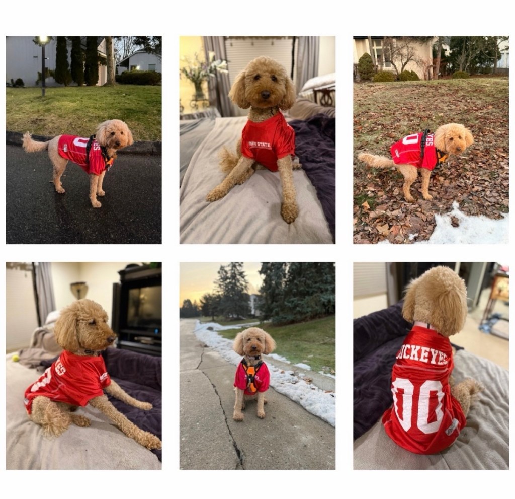 My poor, innocent Maizey (who was named for the Maize and Blue school colors) was forced into an Ohio State Buckeyes jersey. She looked confused. Betrayed. Emotionally conflicted. And yet… adorable. I, meanwhile, had to do the unthinkable: post the photos for all the world (and my Wolverine family) to see.
