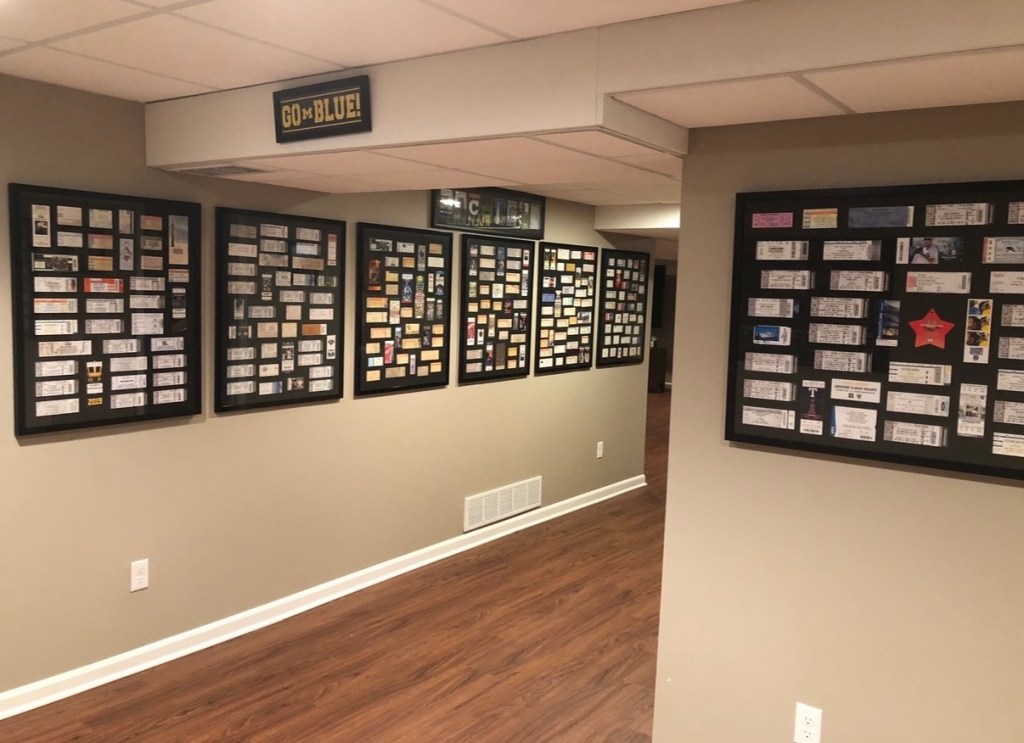 From the moment you walk downstairs, it’s clear where my heart lives. There’s a Michigan carpet on the floor. My ticket stubs from the last forty years are framed on the walls—each one tied to a season, a game, a moment in time. There are photos of me and my friends in the Big House, and photos from my travels around the globe chasing games and experiences, always proudly representing Michigan wherever I go.
