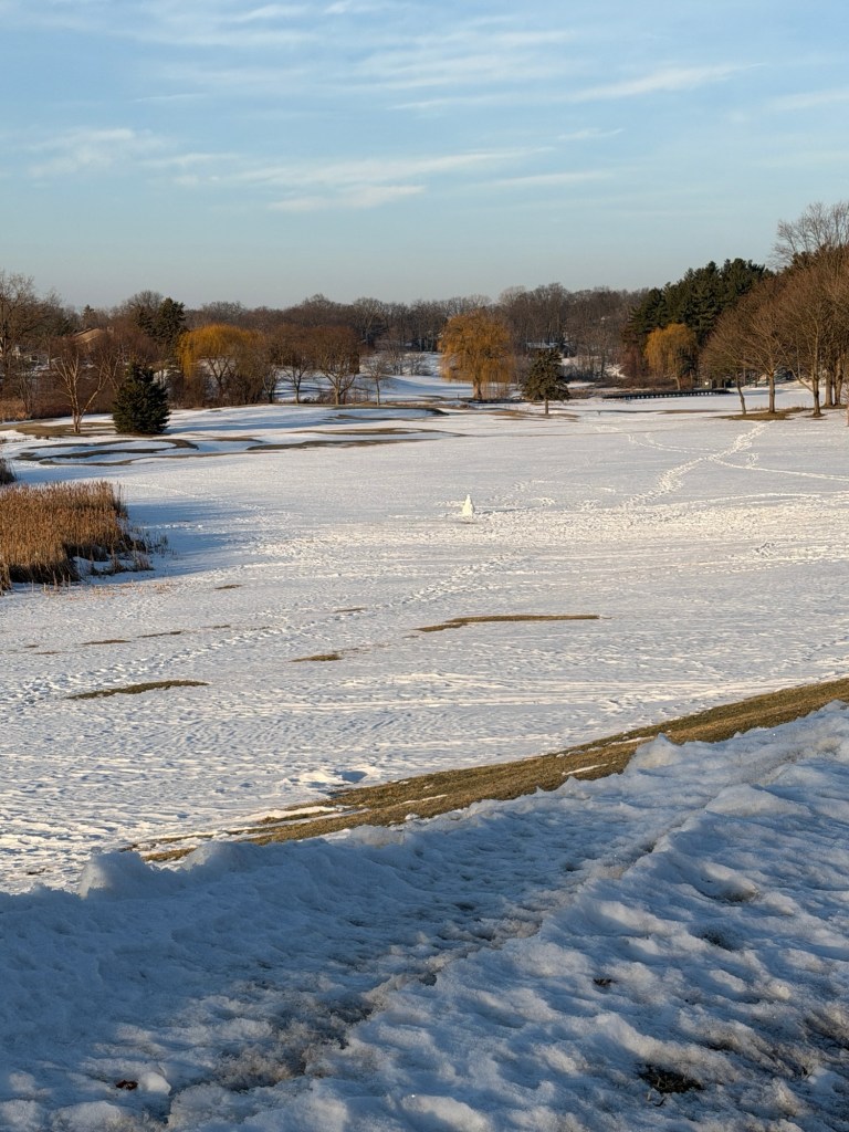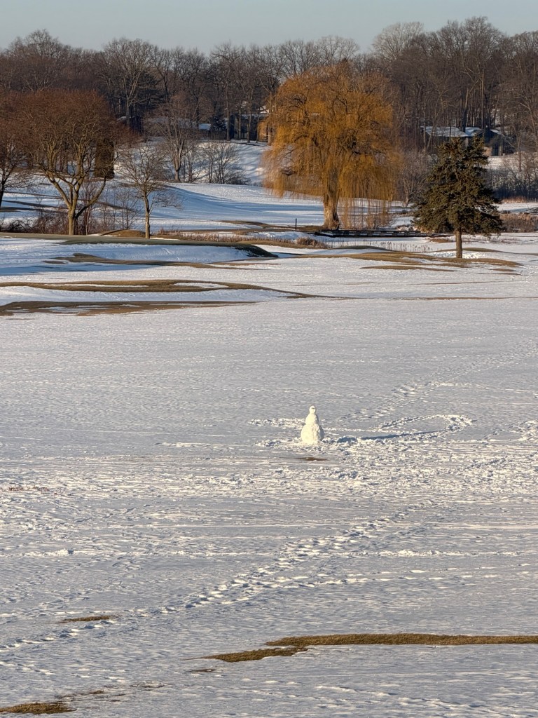 The sun is shining, the temperature has climbed above freezing, and Maizey and I head out for a long walk across the golf course behind our house. Fresh snow under our boots, quiet all around, and a tiny snowman someone built in the middle of the course, just sitting there making people smile as they pass.